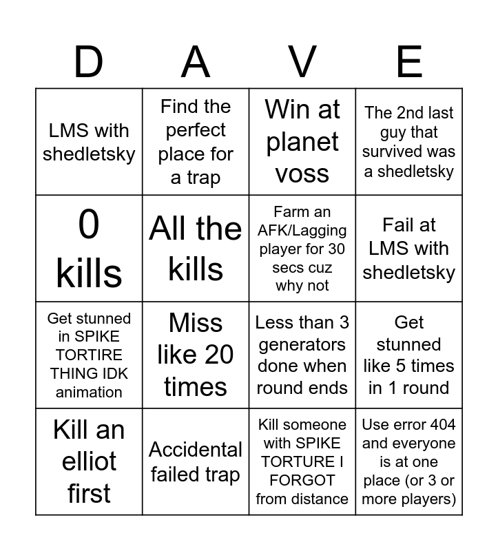 This bingo card has 16 words: Accidental failed trap, Get stunned like 5 times in 1 round, Win at planet voss, LMS with shedletsky, Get stunned in SPIKE TORTIRE THING IDK animation, Find the perfect place for a trap, Less than 3 generators done when round ends, Kill someone with SPIKE TORTURE I FORGOT from distance, 0 kills, All the kills, Kill an elliot first, The 2nd last guy that survived was a shedletsky, Miss like 20 times, Fail at LMS with shedletsky, Farm an AFK/Lagging player for 30 secs cuz why not and Use error 404 and everyone is at one place (or 3 or more players).