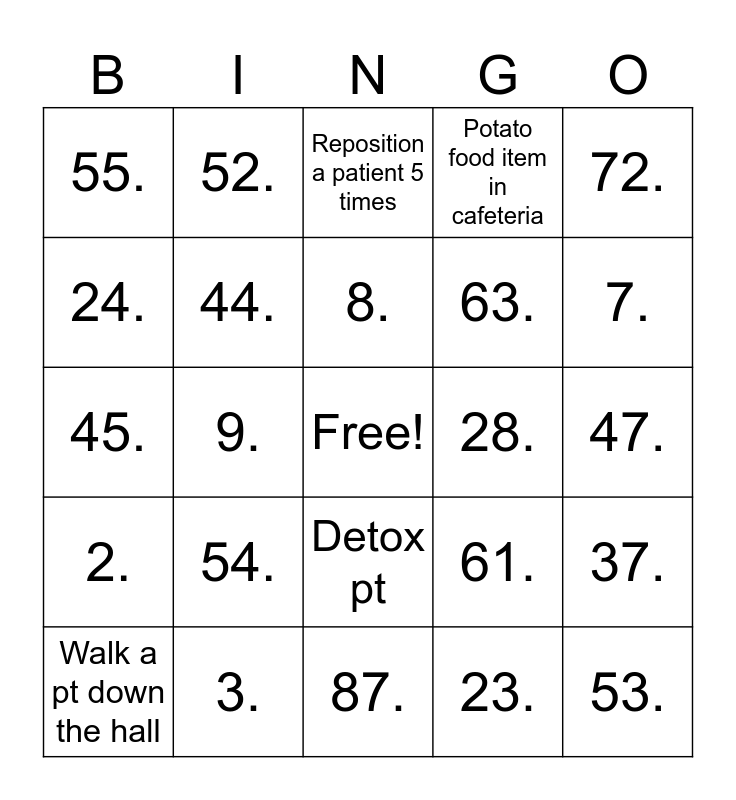 This bingo card has a free space and 118 words: 2 or more box lunches ordered, 6 or more BS checks, More than 10 pts, 3 pts on NC O2, Pt thinks this is the Marriot, CODE BROWN you clean up, Potato food item in cafeteria, Start shift with 3 or more empty rooms, 5 or more self pts, At least 3 completes, 6 or more tele vitals, IV infiltrates/comes out, 2 or more isolation pts, An RN working this shift has a name beginning with A, Full bed change (not bath), Pt with 1:1 sitter, Detox pt, Confused or combative pt, In a room 4x in 1 hr, Help with 5 or more baths, Walk a pt down the hall, Reposition a patient 5 times, Security called this shift, Exceptional family member, 1., 2., 3., 4., 5., 6., 7., 8., 9., 10., 11., 12., 13., 14., 15., 16., 17., 18., 19., 20., 21., 22., 23., 24., 25., 26., 27., 28., 29., 30., 31., 32., 33., 34., 35., 36., 37., 38., 39., 40., 41., 42., 43., 44., 45., 46., 47., 48., 49., 50., 51., 52., 53., 54., 55., 56., 57., 58., 59., 60., 61., 62., 63., 64., 65., 66., 67., 68., 69., 70., 71., 72., 73., 74., 75., 76., 77., 78., 79., 80., 81., 82., 83., 84., 85., 86., 87., 88., 89., 90., 91., 92., 93. and 94..