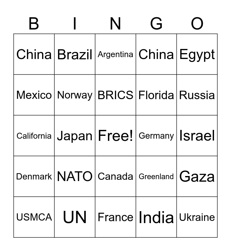 This bingo card has a free space and 24 words: NATO, UN, BRICS, USMCA, Egypt, China, Mexico, Brazil, Germany, Canada, Florida, California, Greenland, Gaza, Norway, India, Israel, Argentina, Russia, Japan, Ukraine, Denmark, China and France.