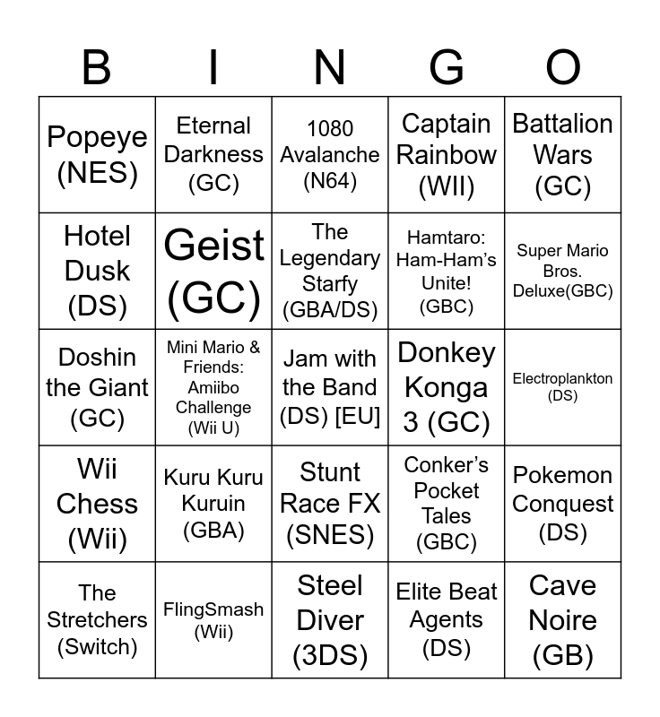 This bingo card has 75 words: Mario Pinball Land (GBA), Dr. Luigi (Wii U), 1080 Avalanche (N64), Link’s Crossbow Training (Wii), Wario: Master of Disguise (DS), DK Jungle Climber (DS), Master of Illusion (DS) [US], Yoshi’s Safari (SNES), Gumshoe (NES), Tomato Adventure (GBA), Cave Noire (GB), Snoopy Concert (SNES), The Legendary Starfy (GBA/DS), Hotel Dusk (DS), Code Name S.T.E.A.M (3DS), Mini Mario & Friends: Amiibo Challenge (Wii U), Mole Mania (GB), Jam with the Band (DS) [EU], Startropics (NES), Battalion Wars (GC), Odama (GC), Doshin the Giant (GC), Geist (GC), Eternal Darkness (GC), Captain Rainbow (WII), Endless Ocean (Wii), Pandora’s Tower (Wii), Sin & Punishment: Star Successor (Wii), Excite Truck (Wii), Disaster: Day of Crisis (Wii), Devil World (NES), Killer Instinct (SNES), Mario Clash (VB), Conker’s Pocket Tales (GBC), Super Mario Bros. Deluxe(GBC), Hamtaro: Ham-Ham’s Unite! (GBC), Yoshi’s Universal Gravitation (GBA) [EU], Another Code: Two Memories (DS) [EU], Electroplankton (DS), Elite Beat Agents (DS), Freshly- Picked Tingle’s Rosy Rupeland (DS), Fossil Fighters (DS), Active Health with Carol Vorderman (DS), SiNG Party (Wii U), Good Job! (Switch), Jump Rope Challenge (Switch), The Stretchers (Switch), Popeye (NES), Clu Clu Land (NES), Solstice: The Quest for the staff of Demnos (NES), Wario Blast: Featuring Bomberman! (GB), Stunt Race FX (SNES), Panel de Pon (SNES), Nester’s Funky Bowling (VB), Custom Robo V2 (N64), Mario Artist: Communication Kit (N64DD), F-Zero X: Expansion Kit (N64DD), Warlocked (GBC), Pocket Soccer (GBC), Napoleon (GBA), Kuru Kuru Kuruin (GBA), F-Zero Climax (GBA), Drill Dozer (GBA), Wave Race: Blue Storm (GC), Chibi-Robo (GC), Donkey Konga 3 (GC), Meteos (DS), Osu! Tatakae! Ouendan! (DS), Yakuman DS (DS), Pokemon Conquest (DS), Wii Chess (Wii), FlingSmash (Wii), The Last Story (Wii), Steel Diver (3DS) and Ever Oasis (3DS).