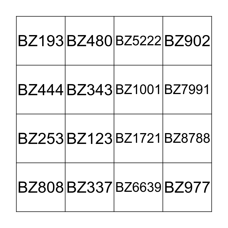 This bingo card has a free space and 15 words: BZ808, BZ977, BZ5222, BZ193, BZ7991, BZ444, BZ123, BZ6639, BZ343, BZ253, BZ8788, BZ902, BZ1001, BZ480 and BZ337.