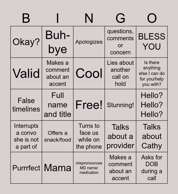 This bingo card has a free space and 24 words: Offers a snack/food, Mama, Cool, Purrrfect, BLESS YOU, Okay?, Valid, Buh-bye, Stunning!, Turns to face us while on the phone, Lies about another call on hold, False timelines, Talks about a provider, Talks about Cathy, Makes a comment about an accent, Makes a comment about an accent, Hello?Hello?Hello?, Apologizes, Is there anything else I can do for you/help you with?, Full name and title, Asks for DOB during a call, Interrupts a convo she is not a part of, questions, comments or concern and mispronounces MD name/ medication.