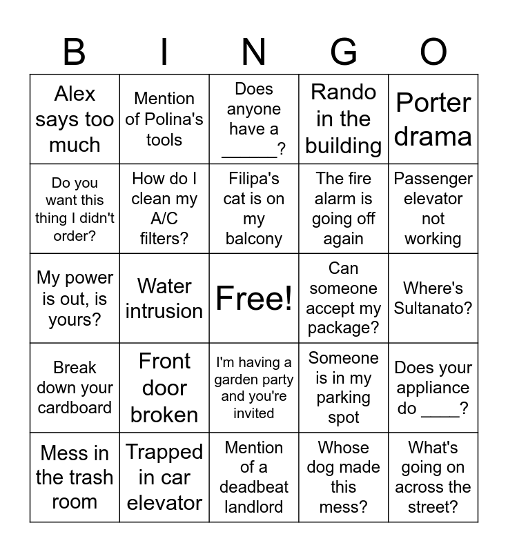 This bingo card has a free space and 24 words: Front door broken, Trapped in car elevator, Filipa's cat is on my balcony, Mess in the trash room, Porter drama, Alex says too much, Do you want this thing I didn't order?, Mention of Polina's tools, Can someone accept my package?, I'm having a garden party and you're invited, The fire alarm is going off again, My power is out, is yours?, Someone is in my parking spot, Does your appliance do ____?, How do I clean my A/C filters?, Whose dog made this mess?, Where's Sultanato?, Does anyone have a ______?, Passenger elevator not working, Water intrusion, What's going on across the street?, Break down your cardboard, Rando in the building and Mention of a deadbeat landlord.