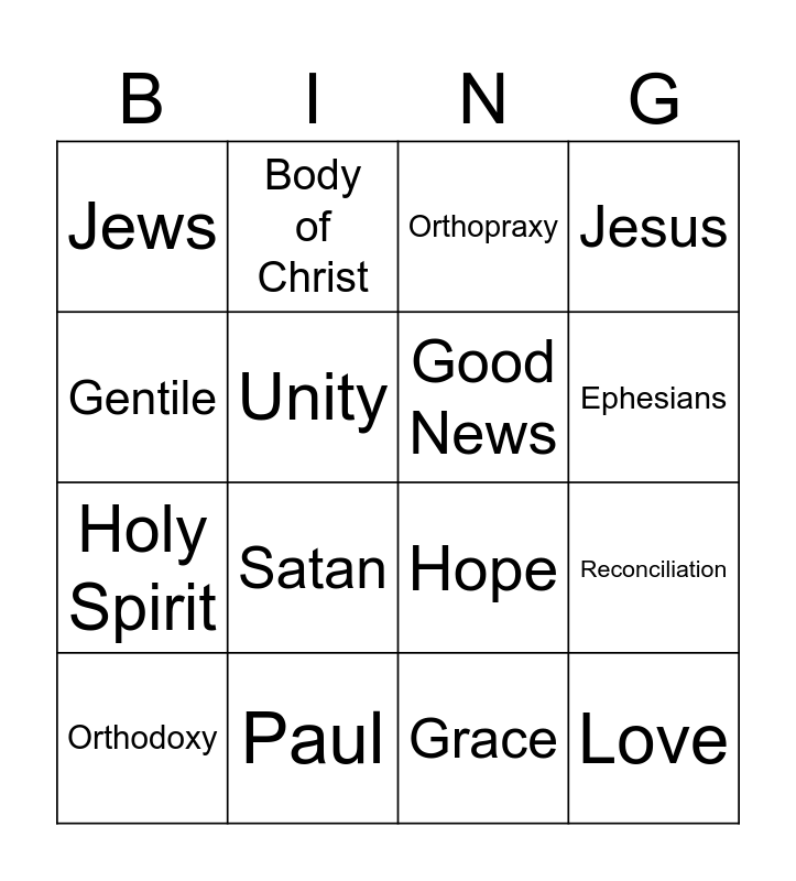 This bingo card has 16 words: Paul, Reconciliation, Orthopraxy, Jews, Holy Spirit, Body of Christ, Hope, Grace, Gentile, Unity, Orthodoxy, Jesus, Satan, Ephesians, Good News and Love.
