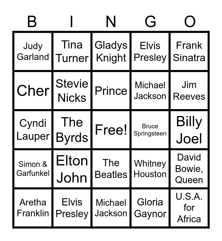 This bingo card has a free space and 24 words: Elton John, Elvis Presley, Prince, Aretha Franklin, Frank Sinatra, Judy Garland, Cher, Tina Turner, Bruce Springsteen, The Beatles, Michael Jackson, Cyndi Lauper, Whitney Houston, David Bowie, Queen, Stevie Nicks, Gloria Gaynor, Billy Joel, Gladys Knight, Jim Reeves, The Byrds, U.S.A. for Africa, Simon & Garfunkel, Elvis Presley and Michael Jackson.