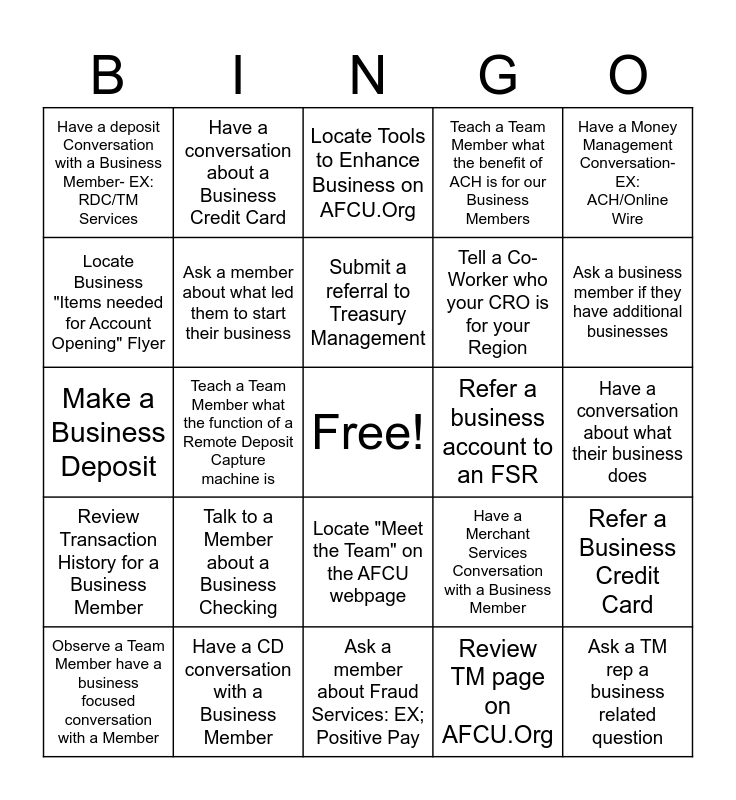 This bingo card has a free space and 24 words: Talk to a Member about a Business Checking, Have a CD conversation with a Business Member, Submit a referral to Treasury Management, Observe a Team Member have a business focused conversation with a Member, Have a Money Management Conversation-EX: ACH/Online Wire, Have a deposit Conversation with a Business Member- EX: RDC/TM Services, Locate Business "Items needed for Account Opening" Flyer, Have a conversation about a Business Credit Card, Refer a business account to an FSR, Locate "Meet the Team" on the AFCU webpage, Tell a Co-Worker who your CRO is for your Region, Make a Business Deposit, Have a Merchant Services Conversation with a Business Member, Refer a Business Credit Card, Ask a member about what led them to start their business, Review TM page on AFCU.Org, Have a conversation about what their business does, Locate Tools to Enhance Business on AFCU.Org, Ask a business member if they have additional businesses, Teach a Team Member what the function of a Remote Deposit Capture machine is, Ask a TM rep a business related question, Review Transaction History for a Business Member, Teach a Team Member what the benefit of ACH is for our Business Members and Ask a member about Fraud Services: EX; Positive Pay.
