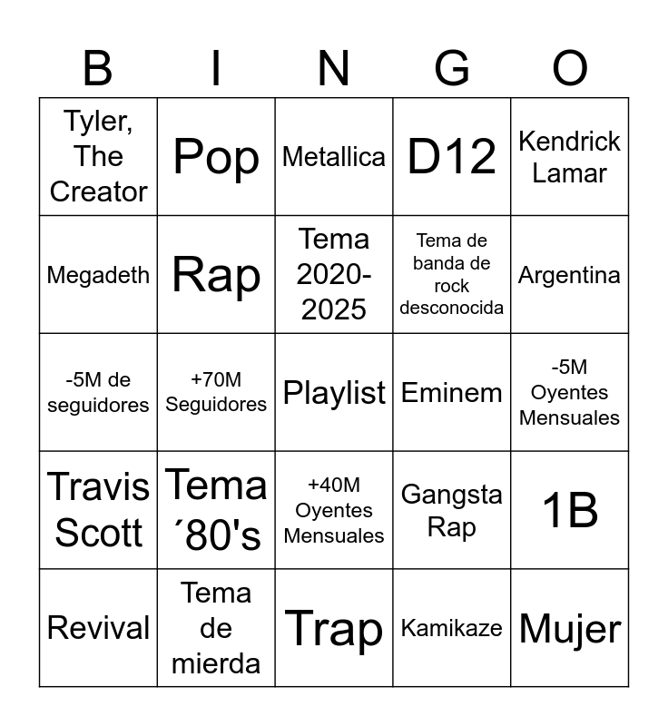 This bingo card has a free space and 24 words: Tema ´80's, Tema de mierda, Tema 2020-2025, Revival, Kendrick Lamar, Tyler, The Creator, Megadeth, Pop, Eminem, +40M Oyentes Mensuales, Tema de banda de rock desconocida, -5M de seguidores, Gangsta Rap, 1B, Rap, Kamikaze, -5M Oyentes Mensuales, Metallica, Argentina, +70M Seguidores, Mujer, Travis Scott, D12 and Trap.
