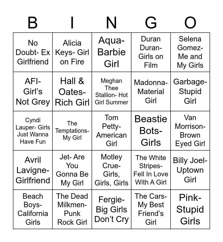 This bingo card has 28 words: Billy Joel- Uptown Girl, Queen- Fat Bottomed Girls, Madonna- Material Girl, The Cars-My Best Friend’s Girl, AFI- Girl’s Not Grey, Aqua- Barbie Girl, Alicia Keys- Girl on Fire, Avril Lavigne- Girlfriend, Beastie Bots- Girls, Beach Boys- California Girls, Cyndi Lauper- Girls Just Wanna Have Fun, Duran Duran- Girls on Film, The Dead Milkmen- Punk Rock Girl, Fergie- Big Girls Don’t Cry, Garbage- Stupid Girl, Gwen Stafani- Hollaback Girl, Jet- Are You Gonna Be My Girl, Hall & Oates- Rich Girl, Meghan Thee Stallion- Hot Girl Summer, Motley Crue- Girls, Girls, Girls, No Doubt- Ex Girlfriend, Pink- Stupid Girls, Tom Petty- American Girl, The Temptations- My Girl, Van Morrison- Brown Eyed Girl, The White Stripes- Fell In Love With A Girl, Selena Gomez- Me and My Girls and Rick Springfield- Jessi’s Girl.