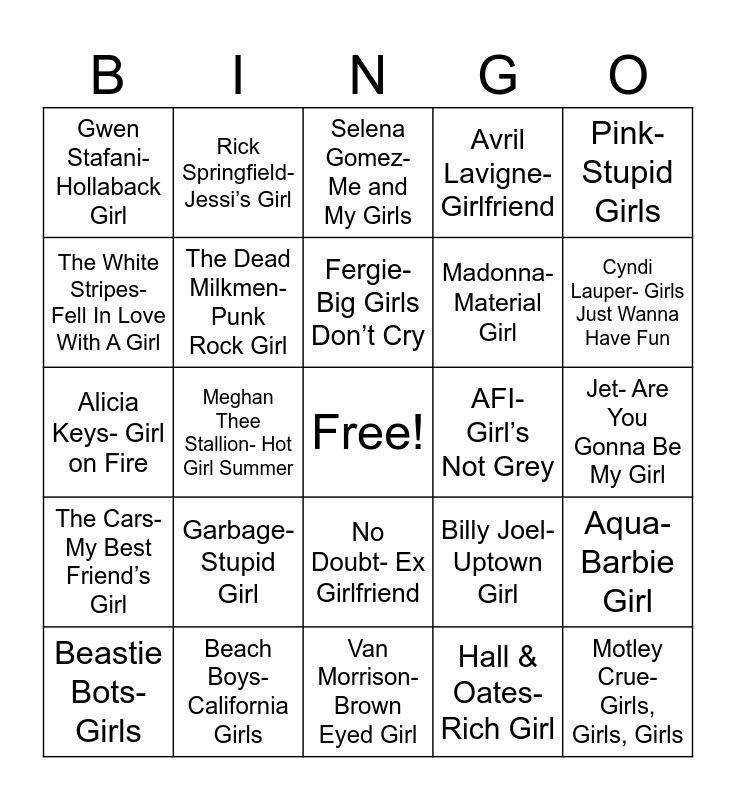 This bingo card has a free space and 27 words: Billy Joel- Uptown Girl, Queen- Fat Bottomed Girls, Madonna- Material Girl, Van Morrison- Brown Eyed Girl, The White Stripes- Fell In Love With A Girl, Selena Gomez- Me and My Girls, Rick Springfield- Jessi’s Girl, The Cars-My Best Friend’s Girl, AFI- Girl’s Not Grey, Aqua- Barbie Girl, Alicia Keys- Girl on Fire, Avril Lavigne- Girlfriend, Beastie Bots- Girls, Beach Boys- California Girls, Cyndi Lauper- Girls Just Wanna Have Fun, Duran Duran- Girls on Film, The Dead Milkmen- Punk Rock Girl, Fergie- Big Girls Don’t Cry, Garbage- Stupid Girl, Gwen Stafani- Hollaback Girl, Jet- Are You Gonna Be My Girl, Hall & Oates- Rich Girl, Meghan Thee Stallion- Hot Girl Summer, Motley Crue- Girls, Girls, Girls, No Doubt- Ex Girlfriend, Pink- Stupid Girls and Tom Petty- American Girl.