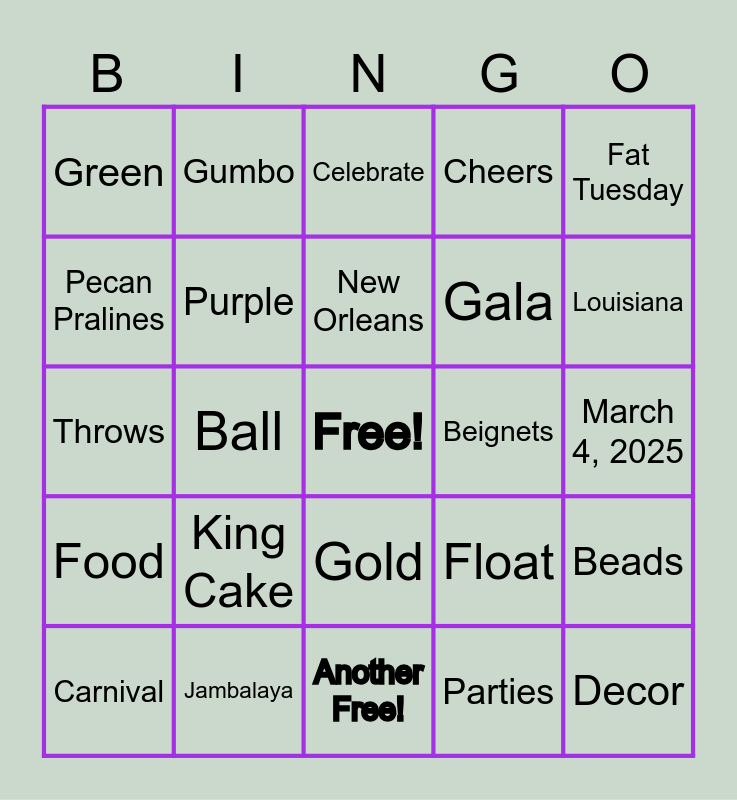 This bingo card has a free space and 24 words: King Cake, Jambalaya, New Orleans, Carnival, Fat Tuesday, Green, Pecan Pralines, Gumbo, Beignets, Gold, Gala, Throws, Float, Beads, Purple, Parties, March 4, 2025, Celebrate, Louisiana, Ball, Decor, Food, Cheers and Another Free!.