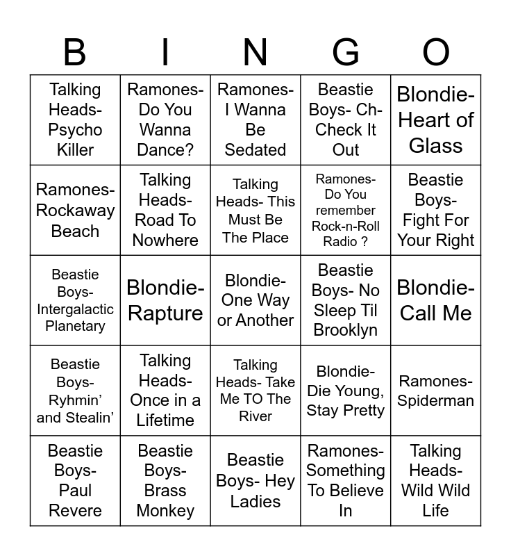 This bingo card has 28 words: Ramones- Spiderman, Ramones- Blitkreig Bop, Ramones- Do You remember Rock-n-Roll Radio ?, Ramones- Something To Believe In, Ramones- Rockaway Beach, Ramones- I Wanna Be Sedated, Ramones- Do You Wanna Dance?, Beastie Boys- Ryhmin’ and Stealin’, Beastie Boys- No Sleep Til Brooklyn, Beastie Boys- Paul Revere, Beastie Boys- Intergalactic Planetary, Beastie Boys- Ch-Check It Out, Beastie Boys- Brass Monkey, Beastie Boys- Hey Ladies, Beastie Boys- Fight For Your Right, Talking Heads- Burning Down The House, Talking Heads- Once in a Lifetime, Talking Heads- Road To Nowhere, Talking Heads- This Must Be The Place, Talking Heads- Take Me TO The River, Talking Heads- Psycho Killer, Talking Heads- Wild Wild Life, Blondie- One Way or Another, Blondie- Rapture, Blondie- Call Me, Blondie- Die Young, Stay Pretty, Blondie- Heart of Glass and Beastie Boys- Girls.