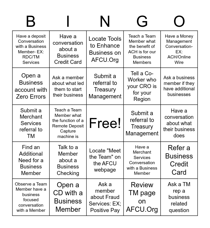 This bingo card has a free space and 24 words: Talk to a Member about a Business Checking, Open a CD with a Business Member, Submit a referral to Treasury Management, Observe a Team Member have a business focused conversation with a Member, Have a Money Management Conversation-EX: ACH/Online Wire, Have a deposit Conversation with a Business Member- EX: RDC/TM Services, Open a Business account with Zero Errors, Have a conversation about a Business Credit Card, Submit a referral to Treasury Management, Locate "Meet the Team" on the AFCU webpage, Tell a Co-Worker who your CRO is for your Region, Submit a Merchant Services referral to TM, Have a Merchant Services Conversation with a Business Member, Refer a Business Credit Card, Ask a member about what led them to start their business, Review TM page on AFCU.Org, Have a conversation about what their business does, Locate Tools to Enhance Business on AFCU.Org, Ask a business member if they have additional businesses, Teach a Team Member what the function of a Remote Deposit Capture machine is, Ask a TM rep a business related question, Find an Additional Need for a Business Member, Teach a Team Member what the benefit of ACH is for our Business Members and Ask a member about Fraud Services: EX; Positive Pay.