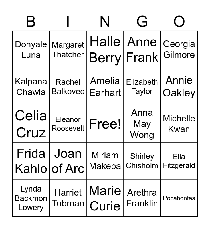 This bingo card has a free space and 24 words: Joan of Arc, Harriet Tubman, Amelia Earhart, Lynda Backmon Lowery, Georgia Gilmore, Donyale Luna, Kalpana Chawla, Margaret Thatcher, Anna May Wong, Miriam Makeba, Elizabeth Taylor, Celia Cruz, Shirley Chisholm, Ella Fitzgerald, Rachel Balkovec, Arethra Franklin, Michelle Kwan, Halle Berry, Annie Oakley, Eleanor Roosevelt, Pocahontas, Frida Kahlo, Anne Frank and Marie Curie.