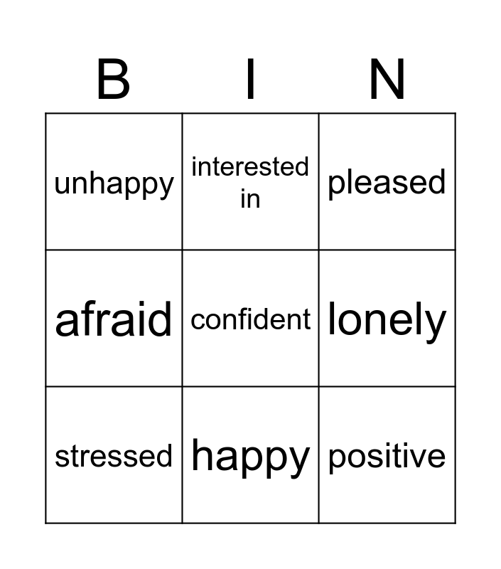 This bingo card has a free space and 8 words: lonely, pleased, interested in, stressed, unhappy, positive, afraid and happy.