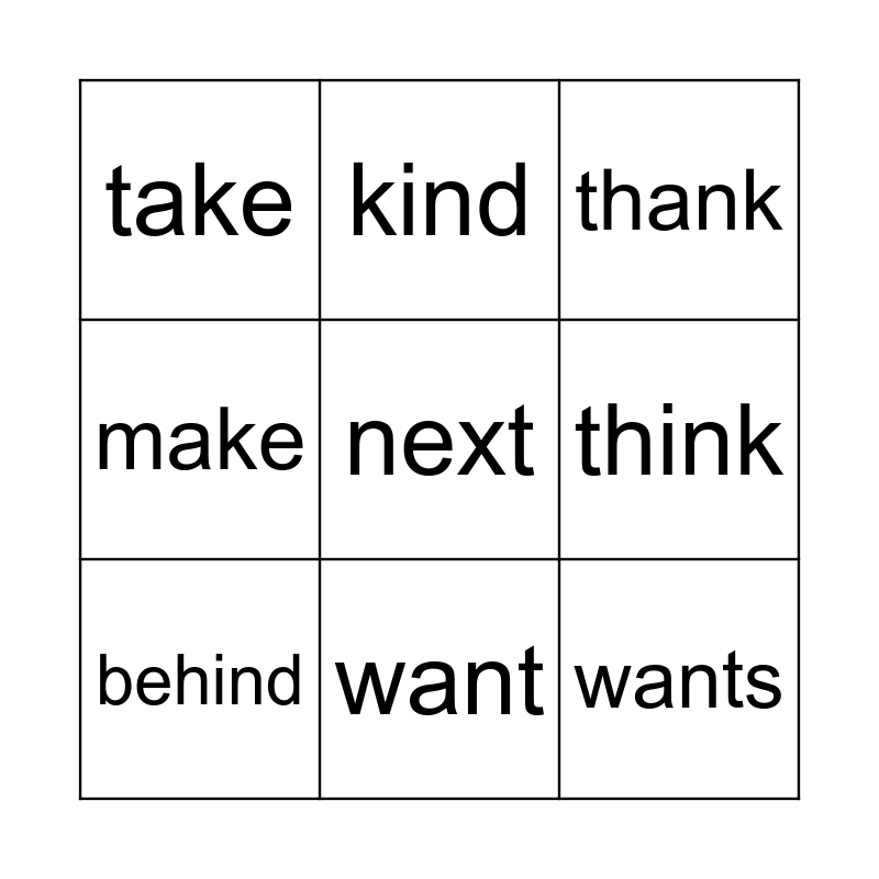 This bingo card has a free space and 11 words: what, want, wants, behind, kind, thank, think, watch, make, take and ago.