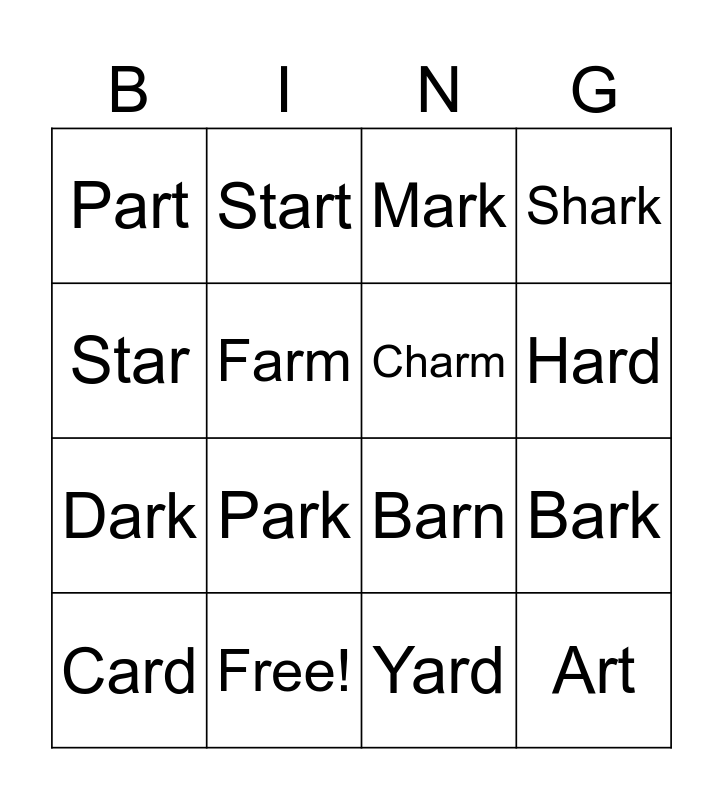 This bingo card has 16 words: Free!, Bark, Mark, Part, Dark, Start, Barn, Yard, Star, Farm, Card, Shark, Park, Hard, Charm and Art.
