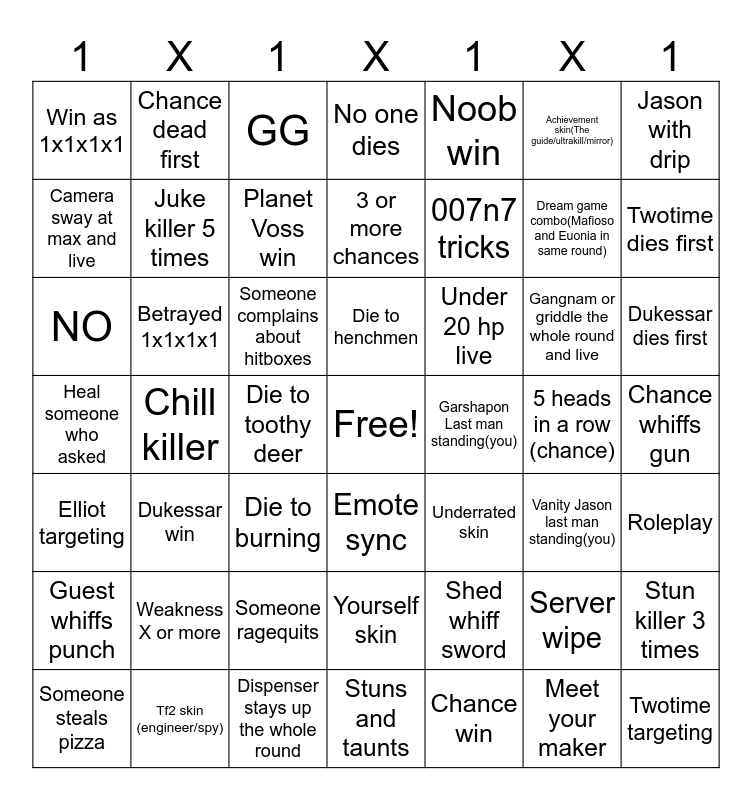 This bingo card has a free space and 48 words: Shed whiff sword, Dream game combo(Mafioso and Euonia in same round), Stuns and taunts, Chill killer, Someone complains about hitboxes, Chance whiffs gun, Chance dead first, Tf2 skin (engineer/spy), Achievement skin(The guide/ultrakill/mirror), Emote sync, Jason with drip, No one dies, Gangnam or griddle the whole round and live, Under 20 hp live, Guest whiffs punch, 5 heads in a row (chance), Camera sway at max and live, Twotime dies first, Server wipe, Noob win, 007n7 tricks, Die to toothy deer, Win as 1x1x1x1, Juke killer 5 times, Stun killer 3 times, Planet Voss win, Dukessar dies first, Someone steals pizza, Die to henchmen, Betrayed 1x1x1x1, Meet your maker, Garshapon Last man standing(you), Roleplay, Weakness X or more, Heal someone who asked, Underrated skin, Vanity Jason last man standing(you), NO, Die to burning, Someone ragequits, Elliot targeting, Twotime targeting, GG, Dispenser stays up the whole round, 3 or more chances, Yourself skin, Dukessar win and Chance win.