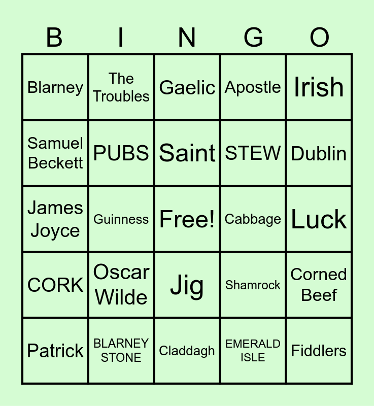 This bingo card has a free space and 58 words: BAGPIPES, BLARNEY STONE, CELTIC, CORK, EMERALD ISLE, POTATO FAMINE, PUBS, SAINT PATRICK, STEW, WHISKEY, Apostle, Feast Day, Ireland, Music, Rainbow, Blarney, Fiddlers, Irish, Parade, Saint, Cabbage, Gaelic, Patrick, Corned Beef, Green, Luck, Pot of Gold, Step Dancing, Dublin, Harp, March, Potato, Tradition, Atlantic, CS Lewis, Eurovision, Folklore, Guinness, James Joyce, Leprechaun, Oscar Wilde, Peat Bogs, Shamrock, Gold, Emerald, Celebrate, Mischief, Jig, Claddagh, Newgrange, Tara, Brian Boru aka Legendary High King of Ireland, Michael Collins, Riverdance, The Troubles, Giant’s Causeway, Samuel Beckett and Yeats.