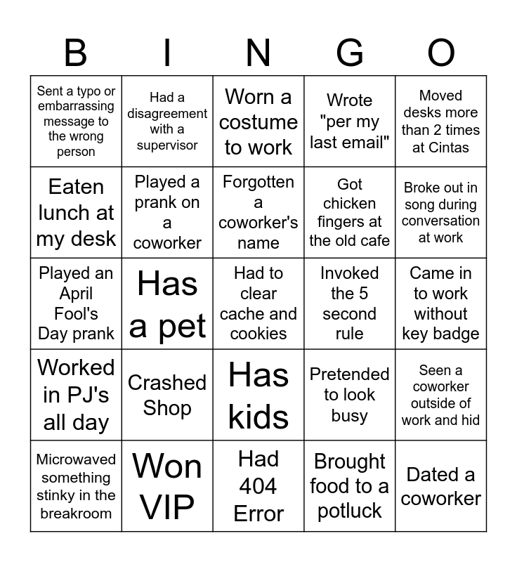 This bingo card has a free space and 24 words: Crashed Shop, Won VIP, Forgotten a coworker's name, Microwaved something stinky in the breakroom, Moved desks more than 2 times at Cintas, Sent a typo or embarrassing message to the wrong person, Eaten lunch at my desk, Had a disagreement with a supervisor, Invoked the 5 second rule, Has kids, Got chicken fingers at the old cafe, Played an April Fool's Day prank, Pretended to look busy, Seen a coworker outside of work and hid, Played a prank on a coworker, Brought food to a potluck, Came in to work without key badge, Worn a costume to work, Broke out in song during conversation at work, Has a pet, Dated a coworker, Worked in PJ's all day, Wrote "per my last email" and Had 404 Error.