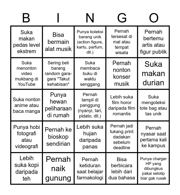 This bingo card has 25 words: Punya hobi fotografi atau videografi, Pernah naik gunung, Pernah tampil di panggung (nyanyi, tari, pidato, dll.), Bisa berbicara lebih dari dua bahasa, Pernah bertemu artis atau figur publik, Suka makan pedas level ekstrem, Bisa bermain alat musik, Punya koleksi barang unik (action figure, kartu, parfum, dll.), Lebih suka film horor daripada film romantis, Pernah nyasar saat pertama kali ke kampus, Suka menonton video mukbang di YouTube, Sering beli barang random gara-gara "Takut kehabisan", Pernah ketiduran saat belajar farmakologi, Pernah jadi tukang print dadakan sebelum deadline, Suka makan durian, Lebih suka kopi daripada teh, Punya hewan peliharaan di rumah, Suka membaca buku di waktu senggang, Pernah nonton konser musik, Suka mengoleksi tote bag atau tas unik, Suka nonton anime atau baca manga, Pernah ke bioskop sendirian, Lebih suka hujan daripada panas, Pernah tersesat di mal atau tempat wisata and Punya charger HP yang dibungkus pakai selotip biar gak rusak.