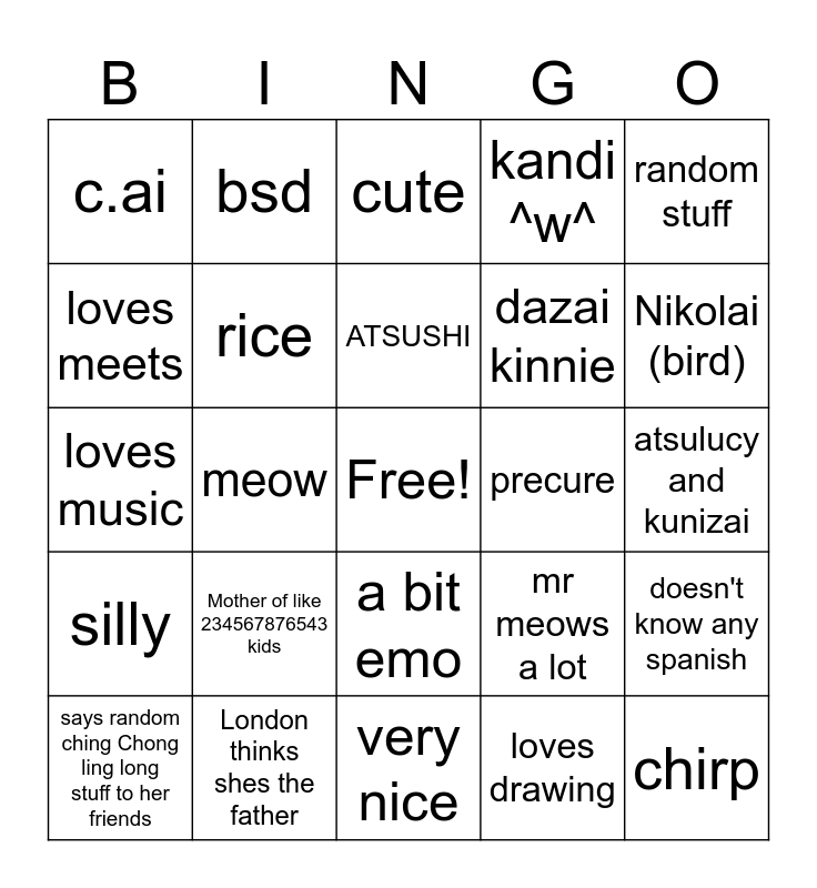 This bingo card has a free space and 24 words: Mother of like 234567876543 kids, London thinks shes the father, ATSUSHI, says random ching Chong ling long stuff to her friends, random stuff, c.ai, loves meets, bsd, precure, a bit emo, dazai kinnie, loves music, mr meows a lot, doesn't know any spanish, rice, loves drawing, atsulucy and kunizai, cute, Nikolai (bird), meow, chirp, silly, kandi ^w^ and very nice.