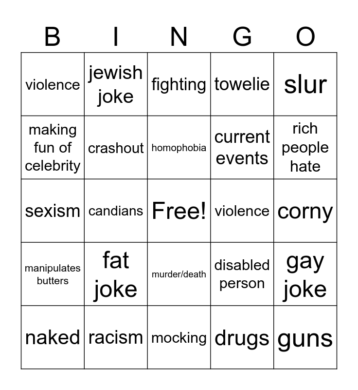 This bingo card has a free space and 24 words: fat joke, racism, homophobia, naked, slur, violence, making fun of celebrity, jewish joke, violence, murder/death, current events, sexism, disabled person, gay joke, crashout, drugs, corny, fighting, rich people hate, candians, guns, manipulates butters, towelie and mocking.