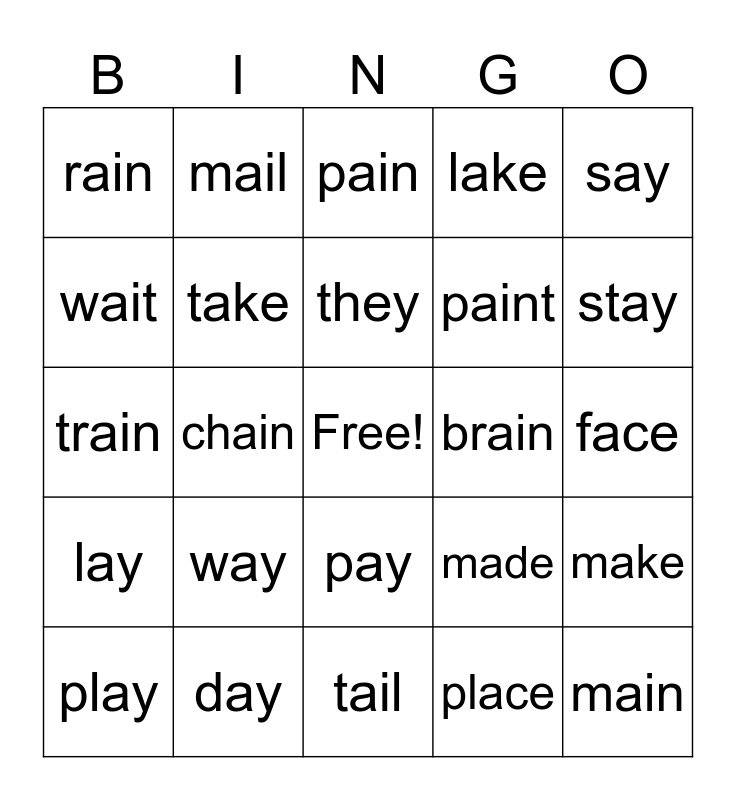 This bingo card has a free space and 24 words: way, day, they, play, say, rain, wait, mail, brain, pay, paint, train, made, make, take, place, face, pain, stay, chain, main, lay, lake and tail.