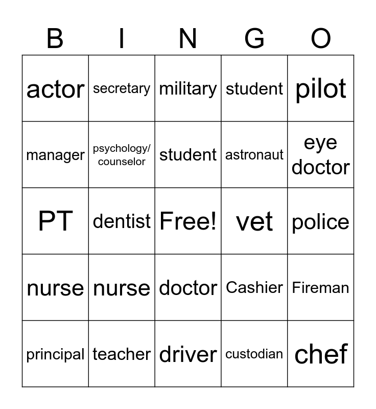 This bingo card has a free space and 24 words: nurse, teacher, student, principal, pilot, actor, manager, secretary, vet, doctor, astronaut, PT, Cashier, Fireman, psychology/ counselor, custodian, police, military, eye doctor, dentist, chef, nurse, student and driver.