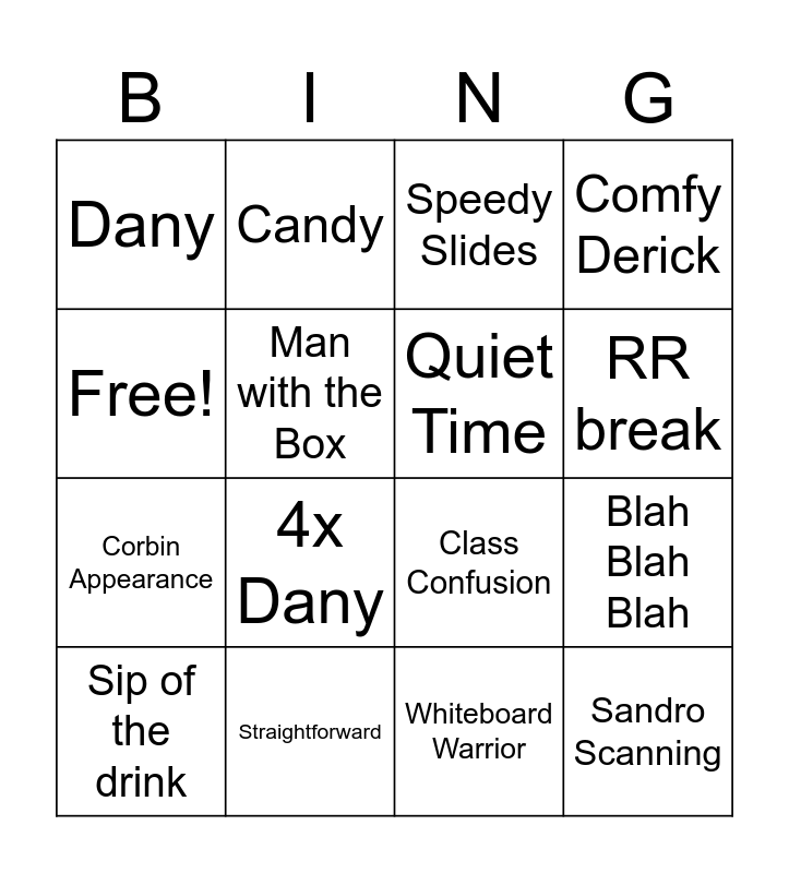 This bingo card has 16 words: Straightforward, Blah Blah Blah, Speedy Slides, Dany, Corbin Appearance, Candy, Class Confusion, Whiteboard Warrior, Free!, Man with the Box, Sip of the drink, Comfy Derick, 4x Dany, RR break, Quiet Time and Sandro Scanning.