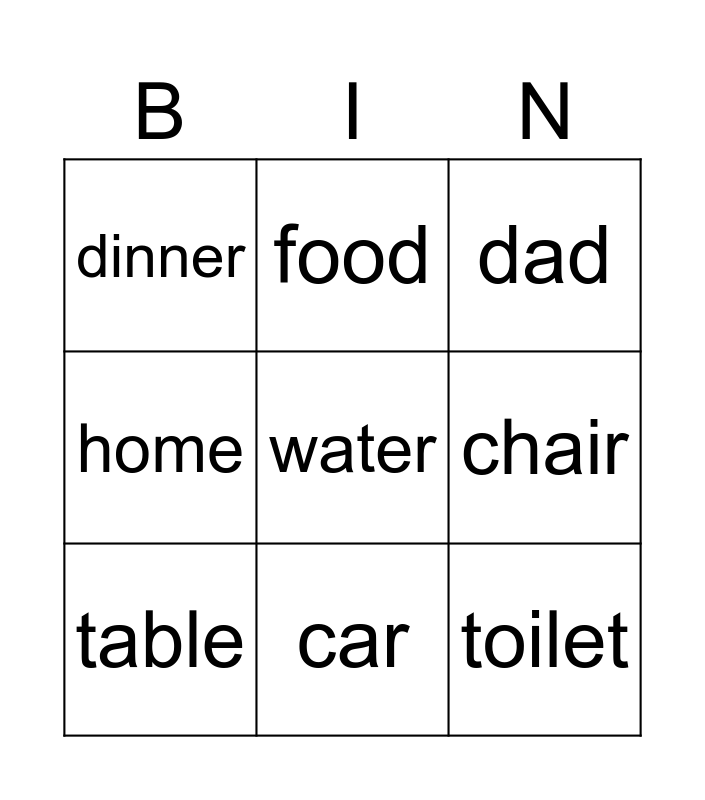 This bingo card has 19 words: Free!, mum, dad, brother, sister, water, biscuit, dinner, food, toilet, bed, chair, table, bath, shower, house, home, car and bus.