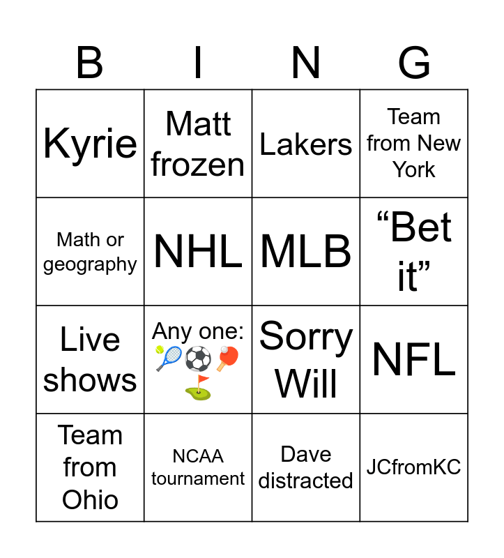 This bingo card has 16 words: NCAA tournament, NFL, Lakers, Kyrie, Live shows, Matt frozen, Sorry Will, Dave distracted, Math or geography, NHL, Team from Ohio, Team from New York, Any one: 🎾⚽️🏓⛳️, “Bet it”, MLB and JCfromKC.