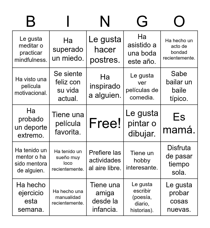 This bingo card has a free space and 100 words: Tiene mascotas., Le gusta bailar., Es mamá., Le gusta leer., Ha viajado fuera del país., Sabe cocinar su plato favorito., Es buena escuchando a los demás., Le encanta el chocolate., Ha aprendido algo nuevo este año., Practica algún deporte., Tiene un talento artístico., Le gusta cantar en la ducha., Se considera creativa., Ha hecho una manualidad recientemente., Le gusta caminar al aire libre., Ha ayudado a un amigo en problemas., Le gusta ver películas de comedia., Se levanta temprano., Disfruta de la música en vivo., Tiene una planta en casa., Le gusta el café., Ha participado en un taller o curso este año., Sabe tocar un instrumento., Se considera una persona positiva., Ha superado un desafío personal., Le gusta pintar o dibujar., Ha hecho un acto de bondad recientemente., Tiene un hobby interesante., Ha aprendido a cocinar un nuevo platillo., Disfruta de los días de lluvia., Tiene una película favorita., Le gusta meditar o practicar mindfulness., Ha practicado algún voluntariado., Tiene una meta clara para este año., Le gusta escribir (poesía, diario, historias)., Ha inspirado a alguien., Disfruta de pasar tiempo sola., Ha leído un libro este mes., Se siente agradecida por algo hoy., Le gusta decorar su hogar., Ha visto una serie completa en un fin de semana., Le gusta hacer ejercicio., Ha probado un deporte extremo., Prefiere el té al café., Sabe bailar un baile típico., Le gusta hacer postres., Ha plantado un árbol., Disfruta de ver el amanecer., Ha asistido a un concierto., Tiene una amiga desde la infancia., Ha escrito una carta a mano., Le gusta coleccionar algo., Ha probado una comida exótica., Ha hecho un picnic recientemente., Se siente orgullosa de un logro reciente., Ha aprendido una nueva habilidad en línea., Disfruta de hacer yoga o pilates., Ha visitado un museo o galería de arte., Prefiere la playa a la montaña., Ha asistido a una boda este año., Le gusta el cine independiente., Ha hecho un cambio de look., Ha tenido una mascota inusual., Le encanta decorar para fiestas., Se considera una persona organizada., Ha tomado clases de baile., Tiene un blog o escribe en redes sociales., Ha dado un consejo valioso a alguien., Se siente cómoda hablando en público., Ha aprendido a manejar una situación difícil., Prefiere cocinar en casa que comer fuera., Ha tenido un sueño muy loco recientemente., Disfruta de las manualidades o el bricolaje., Ha ganado un premio o reconocimiento., Le gusta hacer rompecabezas o acertijos., Ha viajado sola., Disfruta de los momentos en silencio., Ha visto una película motivacional., Se ha inscrito en un curso de desarrollo personal., Le gusta tomar fotos o tiene un ojo artístico., Ha ayudado a un desconocido., Le gusta probar cosas nuevas., Ha hecho un regalo hecho a mano., Prefiere las actividades al aire libre., Se siente conectada con la naturaleza., Ha superado un miedo., Disfruta de los libros de autoayuda., Le gusta visitar lugares históricos., Ha asistido a un taller o conferencia inspiradora., Ha tenido un mentor o ha sido mentora de alguien., Se considera una persona resiliente., Ha donado a una causa benéfica., Le gusta escuchar podcasts., Ha hecho ejercicio esta semana., Se siente feliz con su vida actual., Prefiere las mañanas a las noches., Ha hecho un cambio positivo en su vida este año., Le gusta organizar eventos o reuniones., Ha aprendido algo de una experiencia difícil. and Tiene una rutina de autocuidado..