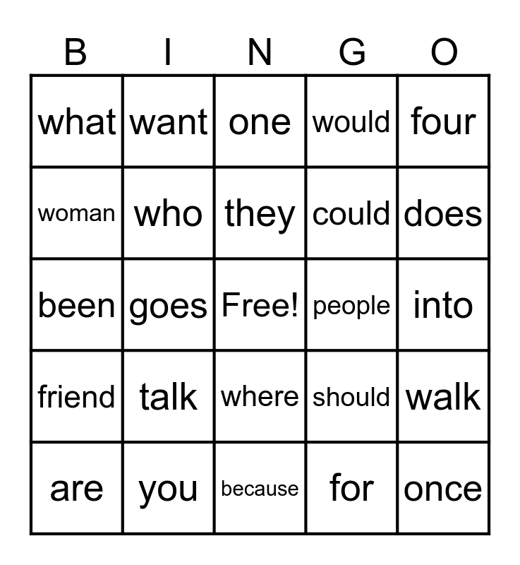 This bingo card has a free space and 24 words: talk, you, they, are, four, what, woman, want, people, where, could, been, should, walk, who, for, into, one, does, goes, once, friend, would and because.