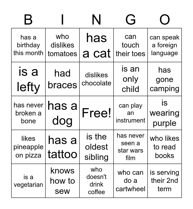 This bingo card has a free space and 24 words: has a tattoo, knows how to sew, dislikes chocolate, is a vegetarian, can speak a foreign language, has a birthday this month, is a lefty, who dislikes tomatoes, can play an instrument, is the oldest sibling, is an only child, has never broken a bone, has never seen a star wars film, who likes to read books, had braces, who can do a cartwheel, is wearing purple, has a cat, has gone camping, has a dog, is serving their 2nd term, likes pineapple on pizza, can touch their toes and who doesn't drink coffee.