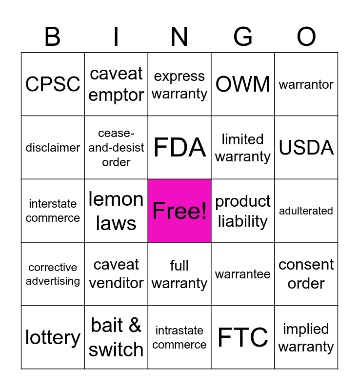 This bingo card has a free space and 24 words: caveat venditor, bait & switch, FDA, lottery, warrantor, CPSC, disclaimer, caveat emptor, product liability, full warranty, limited warranty, interstate commerce, warrantee, consent order, cease-and-desist order, FTC, adulterated, express warranty, USDA, lemon laws, implied warranty, corrective advertising, OWM and intrastate commerce.