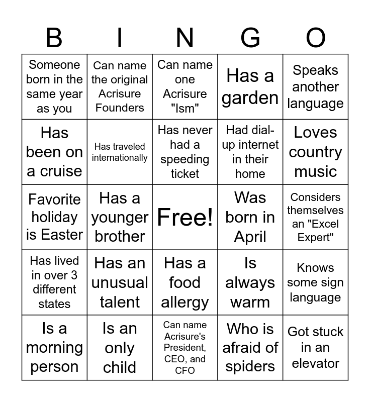 This bingo card has a free space and 24 words: Has an unusual talent, Is an only child, Has never had a speeding ticket, Is a morning person, Speaks another language, Someone born in the same year as you, Has been on a cruise, Can name the original Acrisure Founders, Was born in April, Has a food allergy, Had dial-up internet in their home, Favorite holiday is Easter, Is always warm, Knows some sign language, Has traveled internationally, Who is afraid of spiders, Considers themselves an "Excel Expert", Can name one Acrisure "Ism", Loves country music, Has a younger brother, Got stuck in an elevator, Has lived in over 3 different states, Has a garden and Can name Acrisure's President, CEO, and CFO.