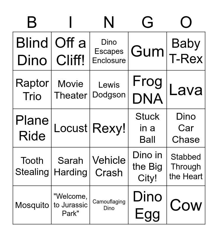 This bingo card has a free space and 24 words: Sarah Harding, "Welcome, to Jurassic Park", Lewis Dodgson, Mosquito, Baby T-Rex, Blind Dino, Raptor Trio, Off a Cliff!, Stuck in a Ball, Vehicle Crash, Frog DNA, Plane Ride, Dino in the Big City!, Stabbed Through the Heart, Movie Theater, Dino Egg, Dino Car Chase, Dino Escapes Enclosure, Lava, Locust, Cow, Tooth Stealing, Gum and Camouflaging Dino.