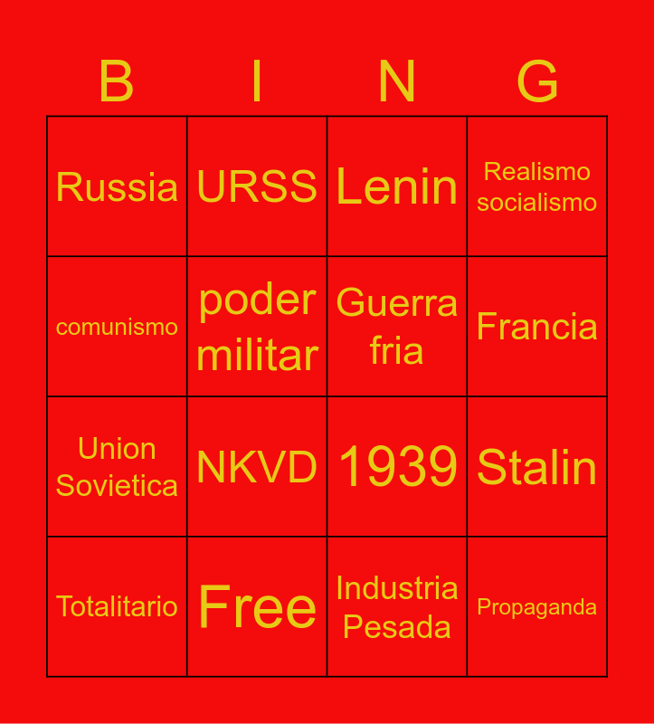 This bingo card has 16 words: Free, Stalin, Lenin, Russia, Union Sovietica, URSS, 1939, Industria Pesada, comunismo, poder militar, Totalitario, Realismo socialismo, NKVD, Francia, Guerra fria and Propaganda.