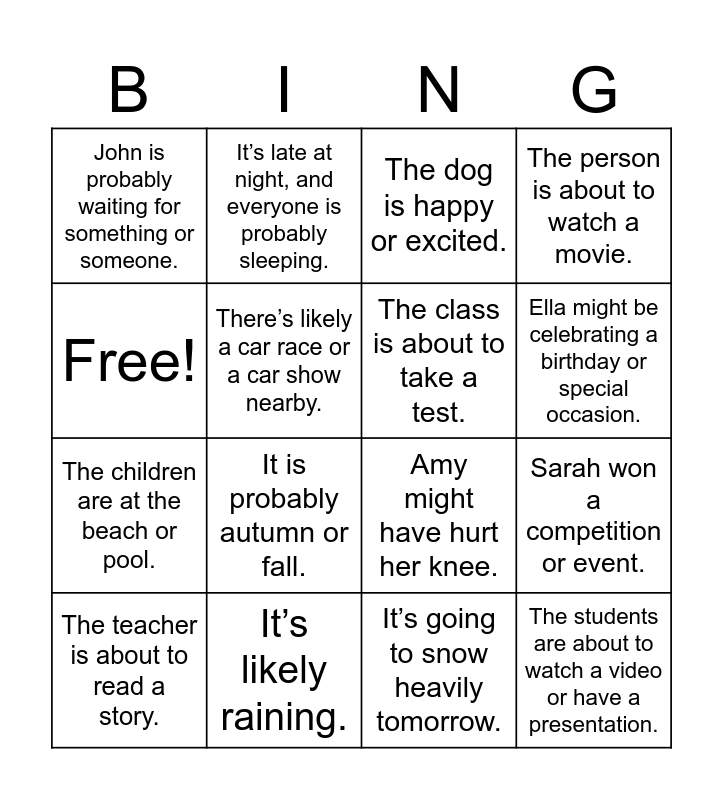 This bingo card has 16 words: It’s likely raining., Sarah won a competition or event., The dog is happy or excited., John is probably waiting for something or someone., The children are at the beach or pool., It’s late at night, and everyone is probably sleeping., Amy might have hurt her knee., It’s going to snow heavily tomorrow., Free!, There’s likely a car race or a car show nearby., The teacher is about to read a story., The person is about to watch a movie., It is probably autumn or fall., Ella might be celebrating a birthday or special occasion., The class is about to take a test. and The students are about to watch a video or have a presentation..