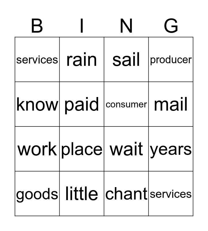 This bingo card has 16 words: little, years, sail, services, work, rain, wait, chant, know, paid, goods, producer, place, mail, consumer and services.