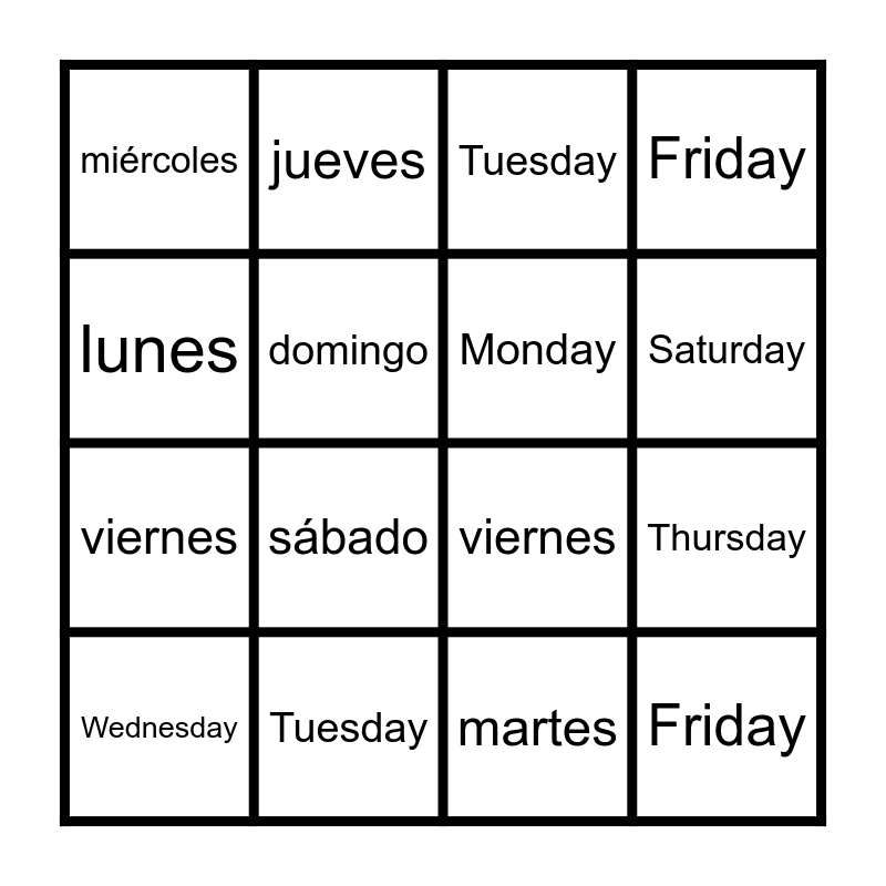 This bingo card has 19 words: viernes, Saturday, Tuesday, Friday, Thursday, lunes, martes, miércoles, jueves, viernes, sábado, domingo, Monday, Tuesday, Wednesday, Thursday, Friday, Saturday and Sunday.
