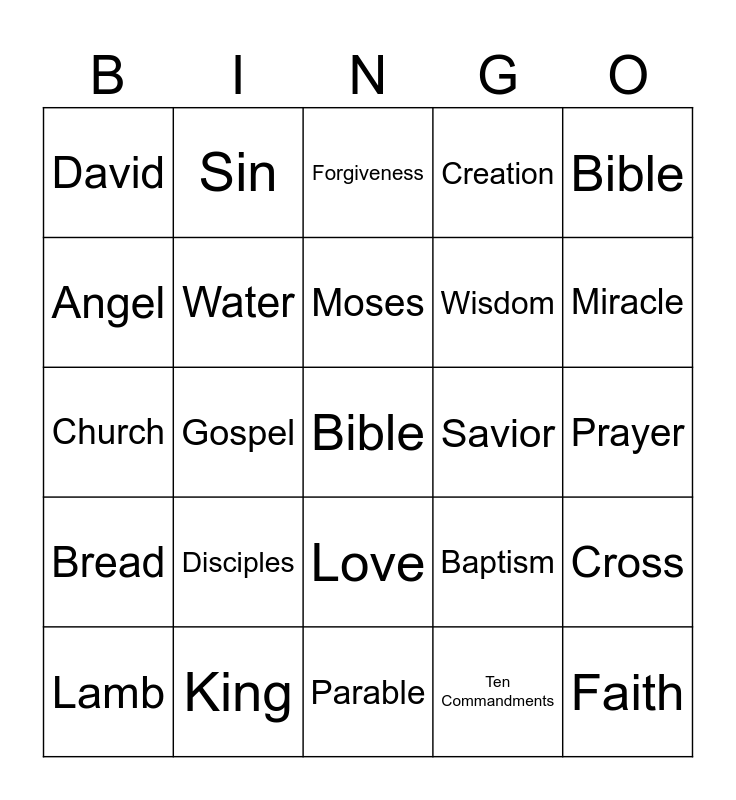 This bingo card has a free space and 42 words: Jesus, Moses, Holy Spirit, Disciples, Ten Commandments, Cross, Faith, Grace, Forgiveness, Love, Prayer, Miracle, Gospel, Bible, Salvation, Baptism, Worship, Church, Heaven, Sin, Angel, Noah, Ark, David, Goliath, Jonah, Wisdom, Hope, Light, Shepherd, Peace, Bread, Water, Parable, Praise, Lamb, King, Savior, Commandments, Good Samaritan, Creation and Promise.