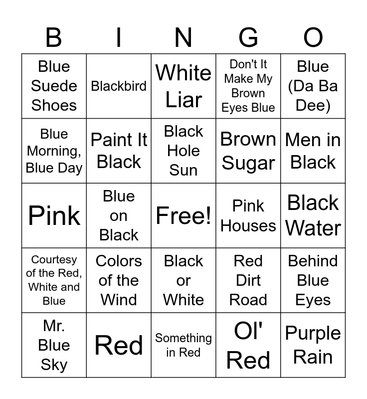 This bingo card has a free space and 64 words: 99 Red Balloons, Back in Black, Band of Gold, Behind Blue Eyes, Big Yellow Taxi, Black Betty, Blackbird, Black Dog, Black Hole Sun, Black Horse and the Cherry Tree, Black or White, Black Velvet, Black Water, Blue (Da Ba Dee), Blue Eyes Crying in the Rain, Blue Morning, Blue Day, Blue on Black, Blue Suede Shoes, Brown Eyed Girl, Brown Sugar, Colors of the Wind, Courtesy of the Red, White and Blue, Don't It Make My Brown Eyes Blue, Golden Years, Goldfinger, Goodbye Yellow Brick Road, Green-Eyed Lady, I Guess That's Why They Call It the Blues, In Color, The Lady in Red, Little Red Corvette, Little White Church, Man on the Silver Mountain, Mellow Yellow, Men in Black, Mr. Blue Sky, Nights in White Satin, Ol' Red, Orange Crush, Paint It Black, Pink, Pink Houses, Pink Pony Club, Purple Haze, The Purple People Eater, Purple Rain, Red, Red Barchette, Red Dirt Road, Redneck Woman, Red Red Wine, Red Skies, Something in Red, Tangled Up in Blue, Tie a Yellow Ribbon Round the Ol' Oak Tree, True Blue, White Liar, White & Nerdy, White Rabbit, White Room, A Whiter Shade of Pale, Yellow, Yellow Ledbetter and Yellow Submarine.