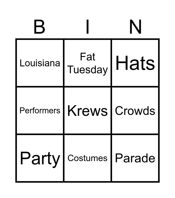This bingo card has a free space and 32 words: Free!, Carnival, Spirits, King Cake, Gold, Party, Parade, Beads, Fat Tuesday, Purple, Costumes, Hats, Masks, Float, Music, Green, New Orleans, Balcony, Dancing, Throw, Queen, Fun, King, Bourbon Street, Marching Bands, Performers, Crawfish, Crowds, Louisiana, Lent, Rex and Baby.