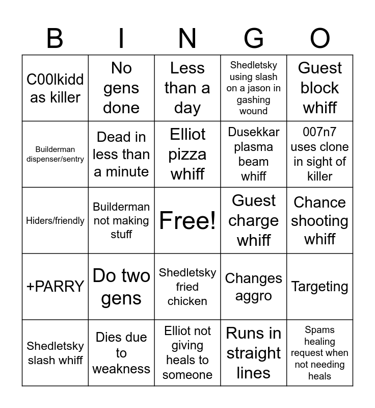 This bingo card has a free space and 24 words: Do two gens, Dies due to weakness, Elliot pizza whiff, Shedletsky slash whiff, Guest block whiff, C00lkidd as killer, Builderman dispenser/sentry, No gens done, Guest charge whiff, Shedletsky fried chicken, Dusekkar plasma beam whiff, Hiders/friendly, Changes aggro, Targeting, Dead in less than a minute, Runs in straight lines, Chance shooting whiff, Less than a day, 007n7 uses clone in sight of killer, Builderman not making stuff, Spams healing request when not needing heals, +PARRY, Shedletsky using slash on a jason in gashing wound and Elliot not giving heals to someone.