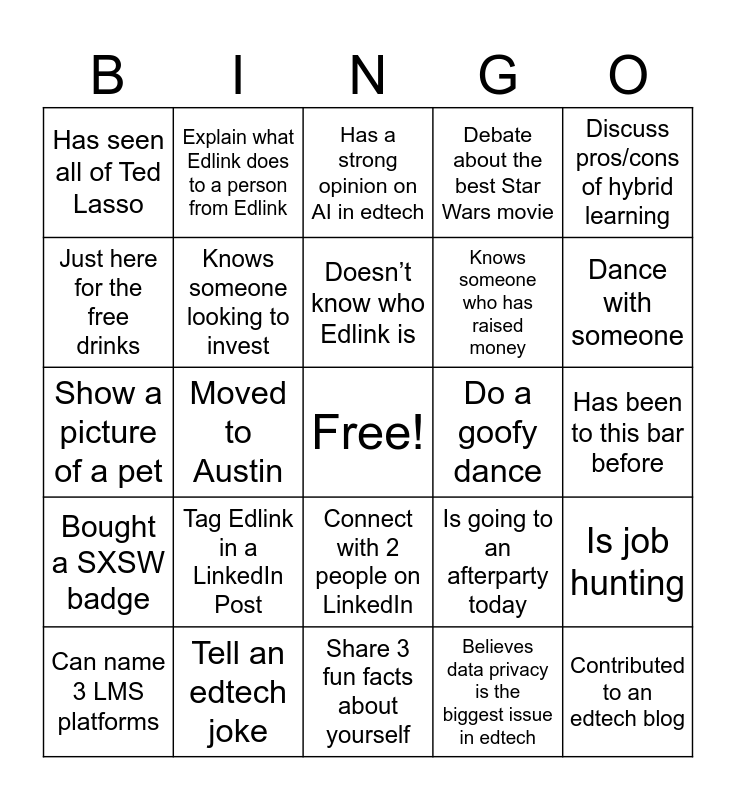 This bingo card has a free space and 44 words: Attended SXSW EDU before, Contributed to an edtech blog, First-time SXSW EDU attendee, Can name 3 LMS platforms, Can name 3 AI edtech tools, Believes data privacy is the biggest issue in edtech, Has a strong opinion on AI in edtech, Works with special ed students, Discuss pros/cons of hybrid learning, Tell an edtech joke, Debate about the best Star Wars movie, Do a goofy dance, Connect with 2 people on LinkedIn, Tag Edlink in a LinkedIn Post, Take a selfie with someone from Edlink, Share 3 fun facts about yourself, Speaks 3+ languages (prove it), Show a picture of a pet, Show a party trick, Dance with someone, Explain what Edlink does to a person from Edlink, Debate the best Disney movie of all time, Discuss the “future of edtech”, Has seen all of Ted Lasso, Knows Edlink’s CEO’s middle name, Has been to this bar before, Doesn’t drink, Has a favorite NA beer, Is going to an afterparty today, Bought a SXSW badge, Didn’t buy a SXSW badge, Is job hunting, Is hiring, First time in Austin, Moved to Austin, Was born in Austin, Is left-handed, Got detention in school, Doesn’t know who Edlink is, Just here for the free drinks, Knows someone who has raised money, Knows someone who has bootstrapped, Knows someone looking to invest and First time in Texas.