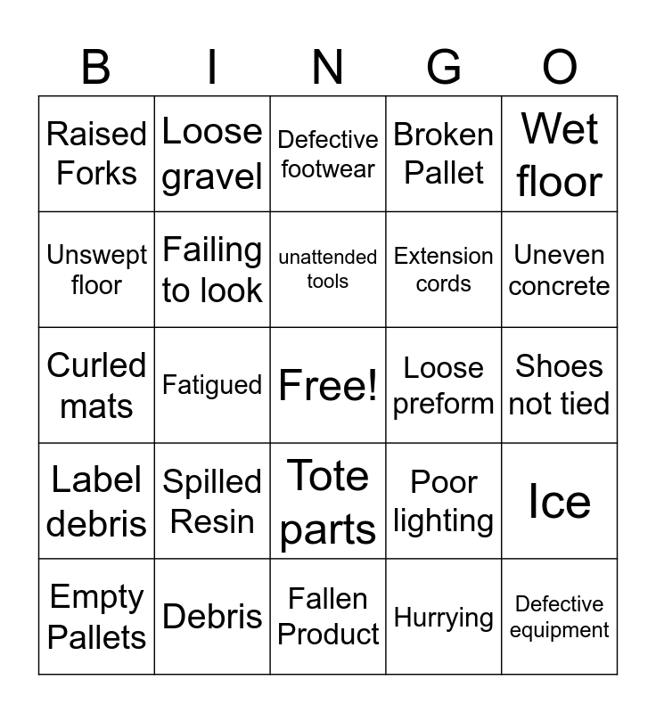 This bingo card has a free space and 24 words: Spilled Resin, Debris, unattended tools, Empty Pallets, Wet floor, Raised Forks, Unswept floor, Loose gravel, Loose preform, Tote parts, Extension cords, Curled mats, Poor lighting, Ice, Failing to look, Hurrying, Shoes not tied, Defective footwear, Uneven concrete, Fatigued, Defective equipment, Label debris, Broken Pallet and Fallen Product.