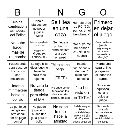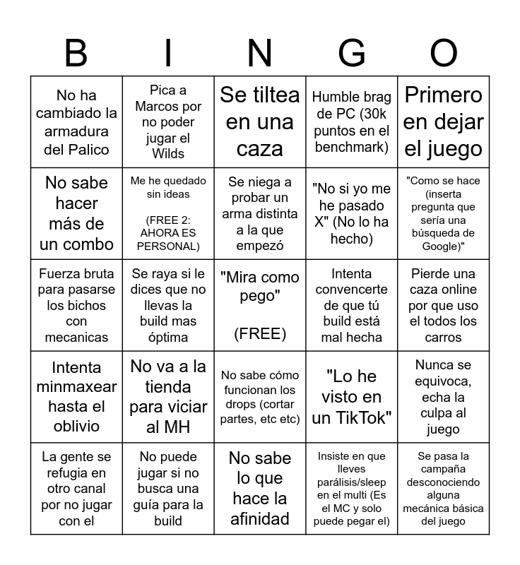 This bingo card has a free space and 24 words: No va a la tienda para viciar al MH, No puede jugar si no busca una guía para la build, Se niega a probar un arma distinta a la que empezó, La gente se refugia en otro canal por no jugar con el, Primero en dejar el juego, No ha cambiado la armadura del Palico, No sabe hacer más de un combo, Pica a Marcos por no poder jugar el Wilds, Intenta convencerte de que tú build está mal hecha, No sabe cómo funcionan los drops (cortar partes, etc etc), "No si yo me he pasado X" (No lo ha hecho), Fuerza bruta para pasarse los bichos con mecanicas, "Lo he visto en un TikTok", Nunca se equivoca, echa la culpa al juego, Me he quedado sin ideas (FREE 2: AHORA ES PERSONAL), Insiste en que lleves parálisis/sleep en el multi (Es el MC y solo puede pegar el), Pierde una caza online por que uso el todos los carros, Se tiltea en una caza, "Como se hace (inserta pregunta que sería una búsqueda de Google)", Se raya si le dices que no llevas la build mas óptima, Se pasa la campaña desconociendo alguna mecánica básica del juego, Intenta minmaxear hasta el oblivio, Humble brag de PC (30k puntos en el benchmark) and No sabe lo que hace la afinidad.