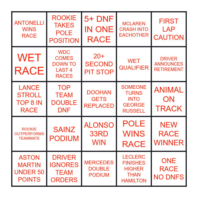 This bingo card has a free space and 24 words: SAINZ PODIUM, DRIVER IGNORES TEAM ORDERS, 20+ SECOND PIT STOP, ASTON MARTIN UNDER 50 POINTS, FIRST LAP CAUTION, ANTONELLI WINS RACE, WET RACE, ROOKIE TAKES POLE POSITION, SOMEONE TURNS INTO GEORGE RUSSELL, ALONSO 33RD WIN, WET QUALIFIER, LANCE STROLL TOP 8 IN RACE, POLE WINS RACE, NEW RACE WINNER, WDC COMES DOWN TO LAST 4 RACES, LECLERC FINISHES HIGHER THAN HAMILTON, ANIMAL ON TRACK, 5+ DNF IN ONE RACE, DRIVER ANNOUNCES RETIREMENT, TOP TEAM DOUBLE DNF, ONE RACE NO DNFS, ROOKIE OUTPERFORMS TEAMMATE, MCLAREN CRASH INTO EACHOTHER and MERCEDES DOUBLE PODIUM.