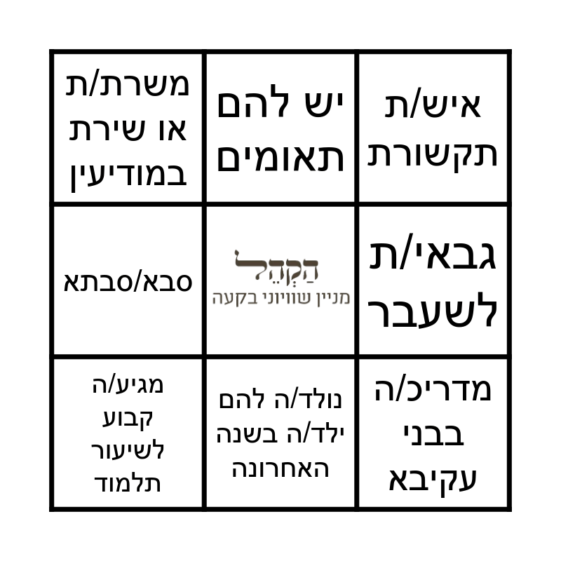 This bingo card has a free space and 51 words: מרצה באוניברסיטה, רופא/ה, עובד/ת בסטארט-אפ עם יותר מחבר קהילה אחד, עובד בשירות המדינה, ממקימי המניין, לא גרים בבקעה, יש להם תאומים, עלו לארץ, גבאי/ת לשעבר, מתפלל/ת בעיקר במניין השכמה, מגיע/ה קבוע לשיעור תלמוד, סבא/סבתא, היו בשליחות בעבר, איש/ת חינוך, רץ/ה במרתון ירושלים, כדרות כתחביב, נולד/ה להם ילד/ה בשנה האחרונה, חגג/ה בר/ת מצווה בשנה האחרונה, מדריכ/ה בצופים, מדריכ/ה בבני עקיבא, אוהד/ת הפועל, לא מוותר/ת על כוס קפה של ערב שבת, משרת/ת או שירת במודיעין, כהן, הילדים שלהם בצוות קידוש, משרת בקרבי, חברים באחת מוועדות הקהילה, בוגר ישיבת הסדר, יודע/ת לתפור, איש/ת תקשורת, born & raised בירושלים, היו חברים בוועד הורים של בתי הספר, עושה יוגה עם מיכל, לא דוברי אנגלית, הולכים ברגל לעבודה, הצטרפו לקהילה בשנה האחרונה, פרסם/ה ספר, משתמש/ת בAI ביומיום, חבר/ה בצוות קידוש, בוגרת מדרשה, תלמיד/ה אפרתה, חניכ/ה בצופים, חניכ/ה בני עקיבא, מרכיב/ה משקפיים, משתתפ/ת בחוג כדורגל, משתתפ/ת בחוג אומנות, שירת/ה במילואים בשנה האחרונה, שר/ה במקהלה, מנגנ/ת בכלי, אוהד/ת הפועל and יש לו/ה הסמכה לרבנות.
